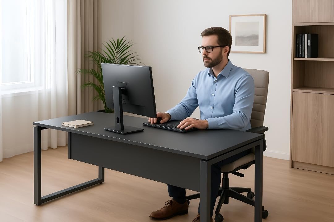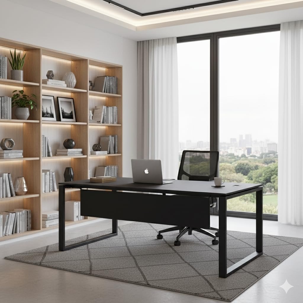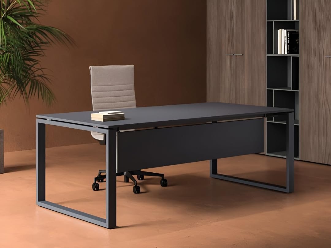 - Premium Modern Executive Design – Sleek, professional office desk crafted with Matte Grey finish on both metal frame and engineered wood top, designed to enhance any corporate cabin, workstation, or home office.