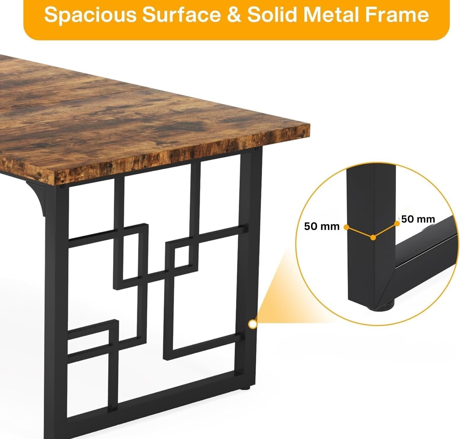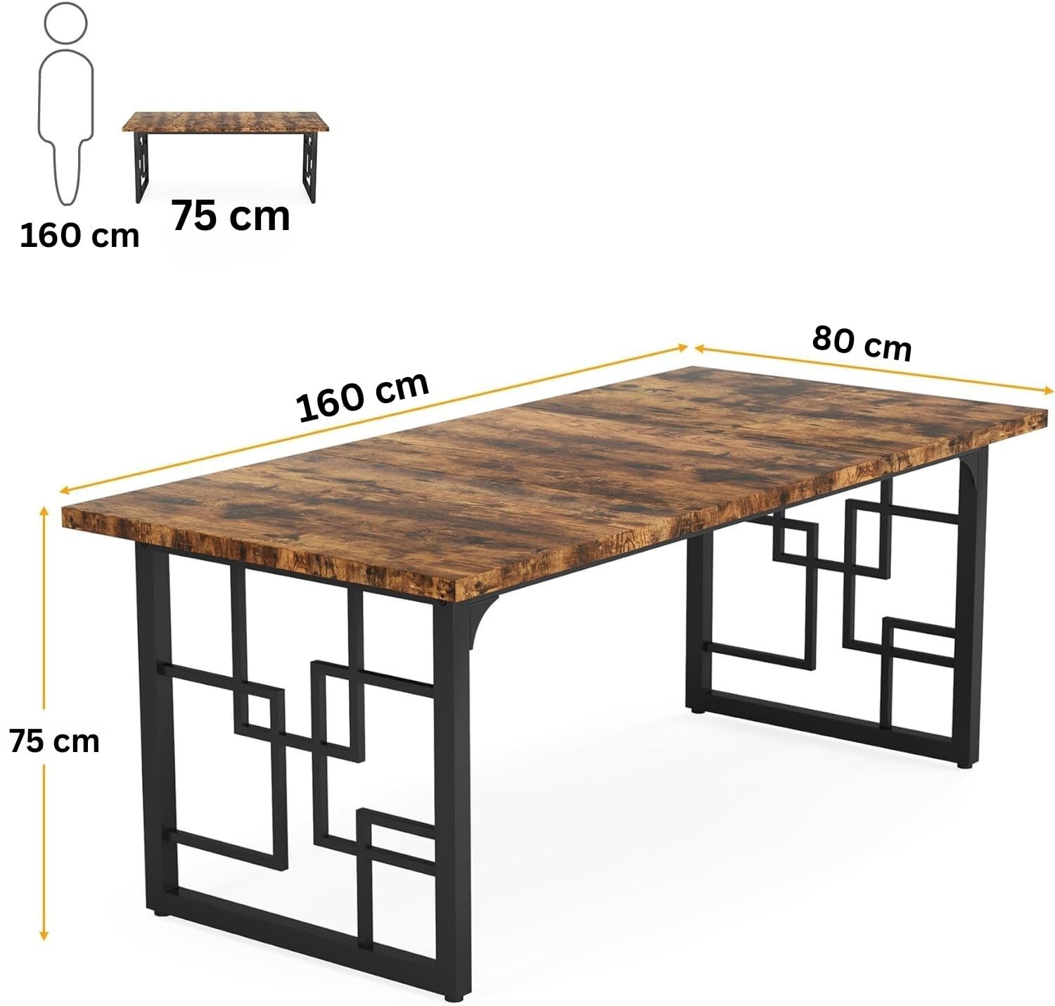 • Product Dimensions: 160 cm length, 80 cm width, and 75 cm height, with color black matte powder-coated metal legs and a premium rustic brown wooden finish